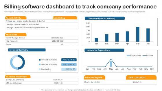 Following slide shows billing software dashboard to track company financial performance. It includes elements such as average revenue, activity record of payments, invoice summary, income and expenditures. Create an editable Billing Software Dashboard Track Building Utility Billing And Invoicing Management System Inspiration Pdf that communicates your idea and engages your audience. Whether you are presenting a business or an educational presentation, pre designed presentation templates help save time. Billing Software Dashboard Track Building Utility Billing And Invoicing Management System Inspiration Pdf is highly customizable and very easy to edit, covering many different styles from creative to business presentations. Slidegeeks has creative team members who have crafted amazing templates. So, go and get them without any delay. Following slide shows billing software dashboard to track company financial performance. It includes elements such as average revenue, activity record of payments, invoice summary, income and expenditures.