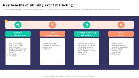 This slide provides an overview of the major benefits of event marketing. The advantages covered are increase brand awareness, reach target audience, build relationship with customers and boost sales. There are so many reasons you need a Key Benefits Of Utilizing Event Marketing Ideas PDF. The first reason is you can not spend time making everything from scratch, Thus, Slidegeeks has made presentation templates for you too. You can easily download these templates from our website easily.