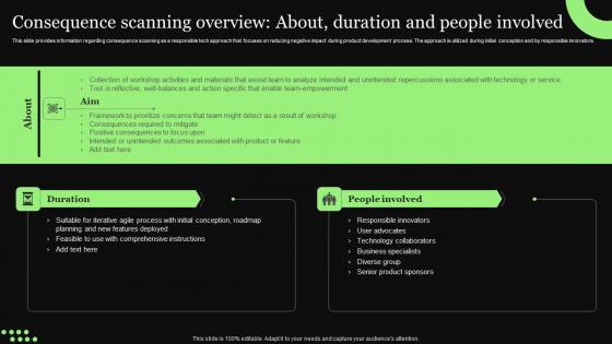 This slide provides information regarding consequence scanning as a responsible tech approach that focuses on reducing negative impact during product development process. The approach is utilized during initial conception and by responsible innovators.There are so many reasons you need a Ethical Technology Utilization Consequence Scanning Overview About Duration Brochure Pdf. The first reason is you can not spend time making everything from scratch, Thus, Slidegeeks has made presentation templates for you too. You can easily download these templates from our website easily. This slide provides information regarding consequence scanning as a responsible tech approach that focuses on reducing negative impact during product development process. The approach is utilized during initial conception and by responsible innovators.