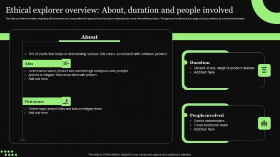 This slide provides information regarding ethical explorer as a responsible tech approach that focuses on detecting risk zones with software product. The approach is utilized at any stage of product delivery by cross functional team. Whether you have daily or monthly meetings, a brilliant presentation is necessary. Ethical Technology Utilization Ethical Explorer Overview About Duration People Elements Pdf can be your best option for delivering a presentation. Represent everything in detail using Ethical Technology Utilization Ethical Explorer Overview About Duration People Elements Pdf and make yourself stand out in meetings. The template is versatile and follows a structure that will cater to your requirements. All the templates prepared by Slidegeeks are easy to download and edit. Our research experts have taken care of the corporate themes as well. So, give it a try and see the results. This slide provides information regarding ethical explorer as a responsible tech approach that focuses on detecting risk zones with software product. The approach is utilized at any stage of product delivery by cross functional team.