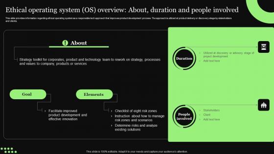 This slide provides information regarding ethical operating system as a responsible tech approach that improves product development process. The approach is utilized at product delivery or discovery stage by stakeholders and clients. Find highly impressive Ethical Technology Utilization Ethical Operating System OS Overview About Duration Download Pdf on Slidegeeks to deliver a meaningful presentation. You can save an ample amount of time using these presentation templates. No need to worry to prepare everything from scratch because Slidegeeks experts have already done a huge research and work for you. You need to download Ethical Technology Utilization Ethical Operating System OS Overview About Duration Download Pdf for your upcoming presentation. All the presentation templates are 100 percent editable and you can change the color and personalize the content accordingly. Download now This slide provides information regarding ethical operating system as a responsible tech approach that improves product development process. The approach is utilized at product delivery or discovery stage by stakeholders and clients.