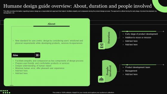 This slide provides information regarding humane design as a responsible tech approach that helps to facilitate empathy and compassion during the product design process. The approach is utilized during the early stage of product development, by management, etc. This Ethical Technology Utilization Humane Design Guide Overview About Duration Slides Pdf is perfect for any presentation, be it in front of clients or colleagues. It is a versatile and stylish solution for organizing your meetings. The Ethical Technology Utilization Humane Design Guide Overview About Duration Slides Pdf features a modern design for your presentation meetings. The adjustable and customizable slides provide unlimited possibilities for acing up your presentation. Slidegeeks has done all the homework before launching the product for you. So, do not wait, grab the presentation templates today This slide provides information regarding humane design as a responsible tech approach that helps to facilitate empathy and compassion during the product design process. The approach is utilized during the early stage of product development, by management, etc.