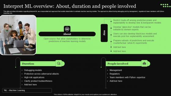 This slide provides information regarding Interpret ML as a responsible tech approach that enable stakeholder to estimate machine learning models. The approach is utilized during debugging and by management, regulators and team members with Python expertise, etc. The best PPT templates are a great way to save time, energy, and resources. Slidegeeks have 100 percent editable powerpoint slides making them incredibly versatile. With these quality presentation templates, you can create a captivating and memorable presentation by combining visually appealing slides and effectively communicating your message. Download Ethical Technology Utilization Interpret ML Overview About Duration People Designs Pdf from Slidegeeks and deliver a wonderful presentation. This slide provides information regarding Interpret ML as a responsible tech approach that enable stakeholder to estimate machine learning models. The approach is utilized during debugging and by management, regulators and team members with Python expertise, etc.
