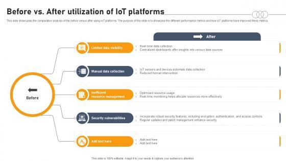 This slide showcases the comparative analysis of the before versus after using IoT platforms. The purpose of this slide is to showcase the different performance metrics and how IoT platforms have improved these metrics. The best PPT templates are a great way to save time, energy, and resources. Slidegeeks have 100 percent editable powerpoint slides making them incredibly versatile. With these quality presentation templates, you can create a captivating and memorable presentation by combining visually appealing slides and effectively communicating your message. Download Before Vs After Utilization Of Iot Platforms Aws IOT Platform Ppt Example from Slidegeeks and deliver a wonderful presentation. This slide showcases the comparative analysis of the before versus after using IoT platforms. The purpose of this slide is to showcase the different performance metrics and how IoT platforms have improved these metrics.