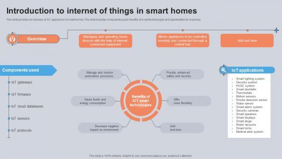 This slide provides an overview of IoT appliances in smart homes. The slide includes components used, benefits of smart technologies and opportunities for business. This Introduction To Internet Of Things In Smart Homes Utilizing Smart Appliances IoT SS V from Slidegeeks makes it easy to present information on your topic with precision. It provides customization options, so you can make changes to the colors, design, graphics, or any other component to create a unique layout. It is also available for immediate download, so you can begin using it right away. Slidegeeks has done good research to ensure that you have everything you need to make your presentation stand out. Make a name out there for a brilliant performance. This slide provides an overview of IoT appliances in smart homes. The slide includes components used, benefits of smart technologies and opportunities for business.