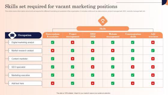 This slide covers information about skill set required for different marketing job available in the organization. It includes skills such as data analysis, project management, SEO, website management, etc. Find a pre-designed and impeccable Skills Set Required For Vacant Marketing Positions Strategic Marketing Campaign Introduction Pdf. The templates can ace your presentation without additional effort. You can download these easy-to-edit presentation templates to make your presentation stand out from others. So, what are you waiting for Download the template from Slidegeeks today and give a unique touch to your presentation. This slide covers information about skill set required for different marketing job available in the organization. It includes skills such as data analysis, project management, SEO, website management, etc.