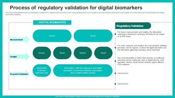 This slide represents the process of regulatory validation for digital biomarkers with known measurements and known insights and novel measurements and novel insights. It is a big challenge for stakeholders and digital biomarkers adoption. Presenting this PowerPoint presentation, titled Process Of Regulatory Validation Digital Biomarkers For Personalized Health Insights Formats Pdf, with topics curated by our researchers after extensive research. This editable presentation is available for immediate download and provides attractive features when used. Download now and captivate your audience. Presenting this Process Of Regulatory Validation Digital Biomarkers For Personalized Health Insights Formats Pdf. Our researchers have carefully researched and created these slides with all aspects taken into consideration. This is a completely customizable Process Of Regulatory Validation Digital Biomarkers For Personalized Health Insights Formats Pdf that is available for immediate downloading. Download now and make an impact on your audience. Highlight the attractive features available with our PPTs. This slide represents the process of regulatory validation for digital biomarkers with known measurements and known insights and novel measurements and novel insights. It is a big challenge for stakeholders and digital biomarkers adoption.