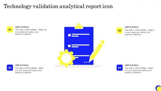Showcasing this set of slides titled Technology Validation Analytical Report Icon Ppt Infographic Template Show Pdf. The topics addressed in these templates are Technology Validation, Analytical Report, Icon. All the content presented in this PPT design is completely editable. Download it and make adjustments in color, background, font etc. as per your unique business setting. Our Technology Validation Analytical Report Icon Ppt Infographic Template Show Pdf are topically designed to provide an attractive backdrop to any subject. Use them to look like a presentation pro.