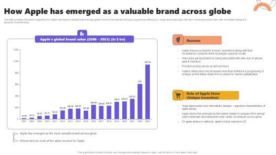 This slide provides information regarding how Apple has become valuable brand across globe in terms of exclusivity and luxury experience offered by it. Apple stores also play vital role in enhancing brand value with minimalistic designs and signature characteristics. Slidegeeks is here to make your presentations a breeze with How Apple Has Emerged As A Valuable Brand Across Globe Portrait PDF With our easy to use and customizable templates, you can focus on delivering your ideas rather than worrying about formatting. With a variety of designs to choose from, you are sure to find one that suits your needs. And with animations and unique photos, illustrations, and fonts, you can make your presentation pop. So whether you are giving a sales pitch or presenting to the board, make sure to check out Slidegeeks first.