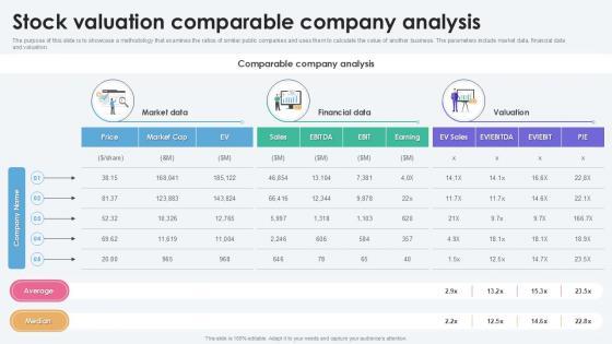 Present like a pro with Stock Valuation Comparable Company Analysis. Create beautiful presentations together with your team, using our easy-to-use presentation slides. Share your ideas in real-time and make changes on the fly by downloading our templates. So whether you are in the office, on the go, or in a remote location, you can stay in sync with your team and present your ideas with confidence. With Slidegeeks presentation got a whole lot easier. Grab these presentations today. The purpose of slide is to represent methodology that evaluate ratios of similar public companies and utilize them to calculate value of another business. The parameters involves market data, financial data and valuation.