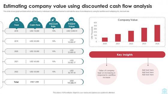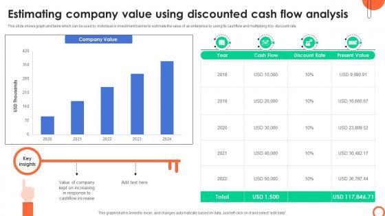 This slide shows graph and table which can be used by individual or investment banker to estimate the value of an enterprise by using its cashflow and multiplying it by discount rate. Coming up with a presentation necessitates that the majority of the effort goes into the content and the message you intend to convey. The visuals of a PowerPoint presentation can only be effective if it supplements and supports the story that is being told. Keeping this in mind our experts created Estimating Company Value Using Discounted Understanding Investment Banking Framework Fin SS V to reduce the time that goes into designing the presentation. This way, you can concentrate on the message while our designers take care of providing you with the right template for the situation. This slide shows graph and table which can be used by individual or investment banker to estimate the value of an enterprise by using its cashflow and multiplying it by discount rate.