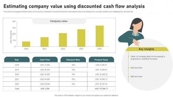 This slide shows graph and table which can be used by individual or investment banker to estimate the value of an enterprise by using its cashflow and multiplying it by discount rate. Coming up with a presentation necessitates that the majority of the effort goes into the content and the message you intend to convey. The visuals of a PowerPoint presentation can only be effective if it supplements and supports the story that is being told. Keeping this in mind our experts created Estimating Company Value Using Investment Banking Simplified Functions Fin SS V to reduce the time that goes into designing the presentation. This way, you can concentrate on the message while our designers take care of providing you with the right template for the situation. This slide shows graph and table which can be used by individual or investment banker to estimate the value of an enterprise by using its cashflow and multiplying it by discount rate.