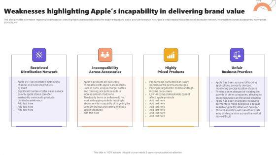 This slide provides information regarding weaknesses of brand highlights characteristics that offer disadvantages and lead to poor performance. Key Apples weaknesses include restricted distribution network, incompatibility across accessories, highly priced products, etc. If your project calls for a presentation, then Slidegeeks is your go to partner because we have professionally designed, easy to edit templates that are perfect for any presentation. After downloading, you can easily edit Weaknesses Highlighting Apples Incapability In Delivering Brand Value Themes PDF and make the changes accordingly. You can rearrange slides or fill them with different images. Check out all the handy templates.