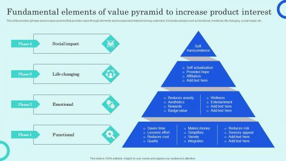 This slide provides glimpse about a value pyramid that provides value through elements and boost product interest among customers. It includes phases such as functional, emotional, life changing, social impact, etc. Slidegeeks is here to make your presentations a breeze with Fundamental Elements Of Value Pyramid To Increase Overview Of Customer Adoption Process Microsoft Pdf With our easy to use and customizable templates, you can focus on delivering your ideas rather than worrying about formatting. With a variety of designs to choose from, youre sure to find one that suits your needs. And with animations and unique photos, illustrations, and fonts, you can make your presentation pop. So whether youre giving a sales pitch or presenting to the board, make sure to check out Slidegeeks first. This slide provides glimpse about a value pyramid that provides value through elements and boost product interest among customers. It includes phases such as functional, emotional, life changing, social impact, etc.