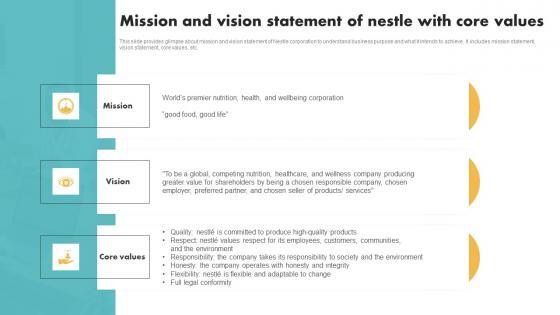 This slide provides glimpse about mission and vision statement of Nestle corporation to understand business purpose and what it intends to achieve. It includes mission statement, vision statement, core values, etc. Are you searching for a Mission And Vision Statement Of Nestle With Core Values Customer Segmentation Themes Pdf that is uncluttered, straightforward, and original It is easy to edit, and you can change the colors to suit your personal or business branding. For a presentation that expresses how much effort you have put in, this template is ideal With all of its features, including tables, diagrams, statistics, and lists, it is perfect for a business plan presentation. Make your ideas more appealing with these professional slides. Download Mission And Vision Statement Of Nestle With Core Values Customer Segmentation Themes Pdf from Slidegeeks today. This slide provides glimpse about mission and vision statement of Nestle corporation to understand business purpose and what it intends to achieve. It includes mission statement, vision statement, core values, etc.