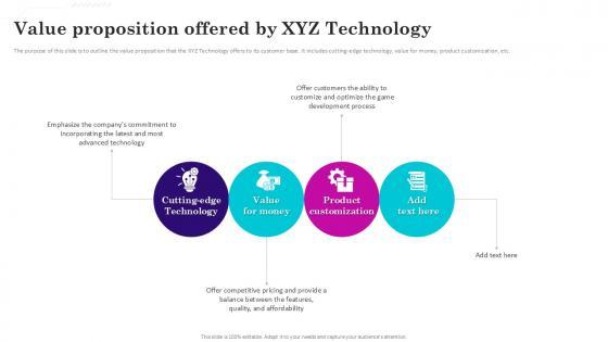 The purpose of this slide is to outline the value proposition that the XYZ Technology offers to its customer base. It includes cutting edge technology, value for money, product customization, etc. Welcome to our selection of the Value Proposition Offered By XYZ Technology Video Game Financing Pitch Deck. These are designed to help you showcase your creativity and bring your sphere to life. Planning and Innovation are essential for any business that is just starting out. This collection contains the designs that you need for your everyday presentations. All of our PowerPoints are 100Percent editable, so you can customize them to suit your needs. This multi purpose template can be used in various situations. Grab these presentation templates today. The purpose of this slide is to outline the value proposition that the XYZ Technology offers to its customer base. It includes cutting edge technology, value for money, product customization, etc.