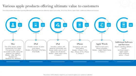 This slide provides information regarding different products and services offered by Apple such as Mac, iPod, iPad, iPhone, Apple Watch, additional software and services. Explore a selection of the finest Various Apple Products Offering Ultimate Value To Customers Apples Proficiency In Optimizing Formats Pdf here. With a plethora of professionally designed and pre-made slide templates, you can quickly and easily find the right one for your upcoming presentation. You can use our Various Apple Products Offering Ultimate Value To Customers Apples Proficiency In Optimizing Formats Pdf to effectively convey your message to a wider audience. Slidegeeks has done a lot of research before preparing these presentation templates. The content can be personalized and the slides are highly editable. Grab templates today from Slidegeeks. This slide provides information regarding different products and services offered by Apple such as Mac, iPod, iPad, iPhone, Apple Watch, additional software and services.