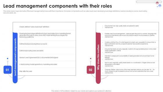 This slide covers major elements of the lead management process with their importance. It includes components such as sales ready lead, developing lead stage definitions, lead processing by source, lead routing rule and alerts, etc. Slidegeeks has constructed Lead Management Components With Their Roles Various Techniques For Managing Structure PDF after conducting extensive research and examination. These presentation templates are constantly being generated and modified based on user preferences and critiques from editors. Here, you will find the most attractive templates for a range of purposes while taking into account ratings and remarks from users regarding the content. This is an excellent jumping-off point to explore our content and will give new users an insight into our top-notch PowerPoint Templates. This slide covers major elements of the lead management process with their importance. It includes components such as sales ready lead, developing lead stage definitions, lead processing by source, lead routing rule and alerts, etc.