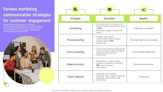 Mentioned slide showcase various marketing communication strategies which can be used by business to increase customer retention rate. It includes strategies such as advertising, personal selling, sales promotion, direct marketing and public relations. The Various Marketing Communication Deployment Of Marketing Communication Topics Pdf is a compilation of the most recent design trends as a series of slides. It is suitable for any subject or industry presentation, containing attractive visuals and photo spots for businesses to clearly express their messages. This template contains a variety of slides for the user to input data, such as structures to contrast two elements, bullet points, and slides for written information. Slidegeeks is prepared to create an impression. Mentioned slide showcase various marketing communication strategies which can be used by business to increase customer retention rate. It includes strategies such as advertising, personal selling, sales promotion, direct marketing and public relations.