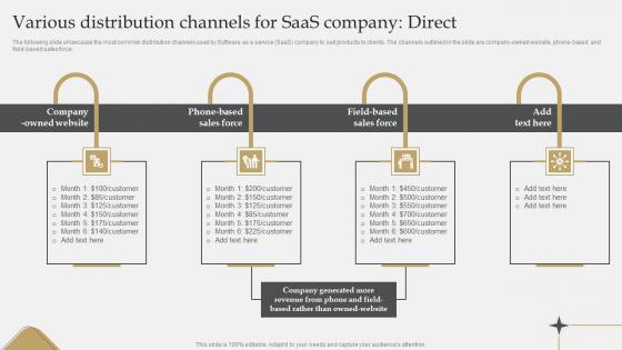The following slide showcases the most common distribution channels used by Software as a service SaaS company to sell products to clients. The channels outlined in the slide are company-owned website, phone-based, and field-based sales force. Formulating a presentation can take up a lot of effort and time, so the content and message should always be the primary focus. The visuals of the PowerPoint can enhance the presenters message, so our Various Distribution Channels For Saas Company Direct Ppt PowerPoint Presentation File Files PDF was created to help save time. Instead of worrying about the design, the presenter can concentrate on the message while our designers work on creating the ideal templates for whatever situation is needed. Slidegeeks has experts for everything from amazing designs to valuable content, we have put everything into Various Distribution Channels For Saas Company Direct Ppt PowerPoint Presentation File Files PDF