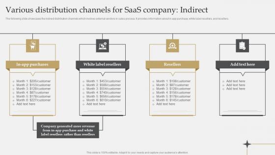 The following slide showcases the indirect distribution channels which involves external vendors in sales process. It provides information about in-app purchase, white label resellers, and resellers. The Various Distribution Channels For SaaS Company Indirect IT Industry Market Research Ideas Pdf is a compilation of the most recent design trends as a series of slides. It is suitable for any subject or industry presentation, containing attractive visuals and photo spots for businesses to clearly express their messages. This template contains a variety of slides for the user to input data, such as structures to contrast two elements, bullet points, and slides for written information. Slidegeeks is prepared to create an impression. The following slide showcases the indirect distribution channels which involves external vendors in sales process. It provides information about in-app purchase, white label resellers, and resellers.