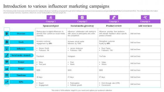 The following slide showcases brief introduction to multiple influencer marketing campaigns through which startups can increase brand awareness and generate higher Return on Investment ROI. The slide provides information about campaign overview, objectives, influencer, social media platforms, format, budget, etc. This modern and well-arranged Introduction To Various Influencer Marketing Campaigns Effective GTM Techniques Summary PDF provides lots of creative possibilities. It is very simple to customize and edit with the Powerpoint Software. Just drag and drop your pictures into the shapes. All facets of this template can be edited with Powerpoint, no extra software is necessary. Add your own material, put your images in the places assigned for them, adjust the colors, and then you can show your slides to the world, with an animated slide included. The following slide showcases brief introduction to multiple influencer marketing campaigns through which startups can increase brand awareness and generate higher Return on Investment ROI. The slide provides information about campaign overview, objectives, influencer, social media platforms, format, budget, etc.