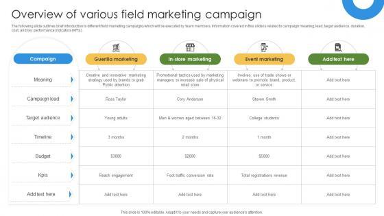 The following slide outlines brief introduction to different field marketing campaigns which will be executed by team members. Information covered in this slide is related to campaign meaning, lead, target audience, duration, cost, and key performance indicators KPIs. Take your projects to the next level with our ultimate collection of Overview Of Various Field Marketing Campaign Sample PDF. Slidegeeks has designed a range of layouts that are perfect for representing task or activity duration, keeping track of all your deadlines at a glance. Tailor these designs to your exact needs and give them a truly corporate look with your own brand colors they will make your projects stand out from the rest