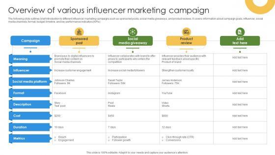 The following slide outlines brief introduction to different influencer marketing campaigns such as sponsored posts, social media giveaways, and product reviews. It covers information about campaign goals, influencer, social media channels, format, budget, timeline, and key performance indicators KPIs Do you know about Slidesgeeks Overview Of Various Influencer Marketing Campaign Information PDF These are perfect for delivering any kind od presentation. Using it, create PowerPoint presentations that communicate your ideas and engage audiences. Save time and effort by using our pre-designed presentation templates that are perfect for a wide range of topic. Our vast selection of designs covers a range of styles, from creative to business, and are all highly customizable and easy to edit. Download as a PowerPoint template or use them as Google Slides themes.