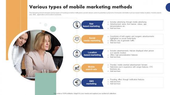 The following slid showcases various types of mobile promotion methods to convert device users to potential customers. It includes elements such as social media, location, mobile search ads, SMS, application and location based etc. From laying roadmaps to briefing everything in detail, our templates are perfect for you. You can set the stage with your presentation slides. All you have to do is download these easy-to-edit and customizable templates. Mobile Ad Campaign Launch Strategy Various Types Of Mobile Marketing Methods Download Pdf will help you deliver an outstanding performance that everyone would remember and praise you for. Do download this presentation today. The following slid showcases various types of mobile promotion methods to convert device users to potential customers. It includes elements such as social media, location, mobile search ads, SMS, application and location based etc.