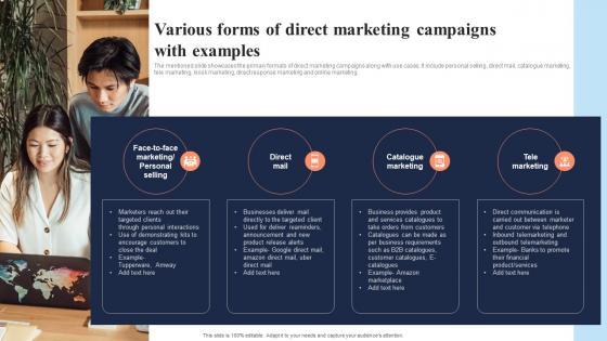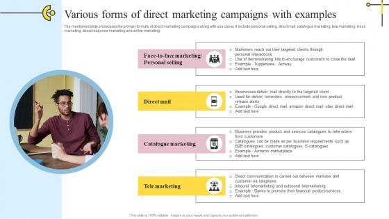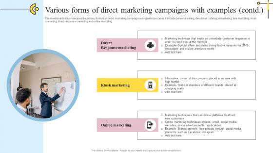 The mentioned slide showcases the primary formats of direct marketing campaigns along with use cases. It include personal selling, direct mail, catalogue marketing, tele marketing, kiosk marketing, direct response marketing and online marketing. This Various Forms Of Direct Marketing Campaigns With Examples In Depth Overview Of Mass Clipart Pdf from Slidegeeks makes it easy to present information on your topic with precision. It provides customization options, so you can make changes to the colors, design, graphics, or any other component to create a unique layout. It is also available for immediate download, so you can begin using it right away. Slidegeeks has done good research to ensure that you have everything you need to make your presentation stand out. Make a name out there for a brilliant performance. The mentioned slide showcases the primary formats of direct marketing campaigns along with use cases. It include personal selling, direct mail, catalogue marketing, tele marketing, kiosk marketing, direct response marketing and online marketing.
