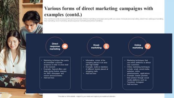 The mentioned slide showcases the primary formats of direct marketing campaigns along with use cases. It include personal selling, direct mail, catalogue marketing, tele marketing, kiosk marketing, direct response marketing and online marketing. Take your projects to the next level with our ultimate collection of Various Forms Of Direct Marketing Campaigns Definitive Guide On Mass Advertising Topics Pdf. Slidegeeks has designed a range of layouts that are perfect for representing task or activity duration, keeping track of all your deadlines at a glance. Tailor these designs to your exact needs and give them a truly corporate look with your own brand colors they well make your projects stand out from the rest. The mentioned slide showcases the primary formats of direct marketing campaigns along with use cases. It include personal selling, direct mail, catalogue marketing, tele marketing, kiosk marketing, direct response marketing and online marketing.
