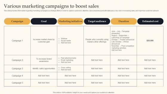 This slide provides information regarding marketing campaigns as strategic efforts in order to capture customers attention, raise awareness and ultimately play a key role in increasing sales, and maximize customer outreach. Make sure to capture your audiences attention in your business displays with our gratis customizable Various Marketing Campaigns Key Business Tactics For Organizational Success Demonstration Pdf. These are great for business strategies, office conferences, capital raising or task suggestions. If you desire to acquire more customers for your tech business and ensure they stay satisfied, create your own sales presentation with these plain slides. This slide provides information regarding marketing campaigns as strategic efforts in order to capture customers attention, raise awareness and ultimately play a key role in increasing sales, and maximize customer outreach.