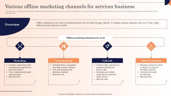 This slide covers meaning along with three offline marketing techniques which can be used by organization to increase brand awareness among target customers. These channels are networking, print advertisement and cold calls.Whether you have daily or monthly meetings, a brilliant presentation is necessary. Various Offline Marketing Channels For Services Business Strategic Marketing Campaign Download Pdf can be your best option for delivering a presentation. Represent everything in detail using Various Offline Marketing Channels For Services Business Strategic Marketing Campaign Download Pdf and make yourself stand out in meetings. The template is versatile and follows a structure that will cater to your requirements. All the templates prepared by Slidegeeks are easy to download and edit. Our research experts have taken care of the corporate themes as well. So, give it a try and see the results. This slide covers meaning along with three offline marketing techniques which can be used by organization to increase brand awareness among target customers. These channels are networking, print advertisement and cold calls.