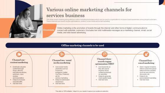 This slide covers meaning along with four online marketing techniques which can be used by organization to increase brand awareness among target customers. These channels are search engine optimizations, content, social media and email marketing.Find highly impressive Various Online Marketing Channels For Services Business Strategic Marketing Campaign Summary Pdf on Slidegeeks to deliver a meaningful presentation. You can save an ample amount of time using these presentation templates. No need to worry to prepare everything from scratch because Slidegeeks experts have already done a huge research and work for you. You need to download Various Online Marketing Channels For Services Business Strategic Marketing Campaign Summary Pdf for your upcoming presentation. All the presentation templates are 100Precent editable and you can change the color and personalize the content accordingly. Download now. This slide covers meaning along with four online marketing techniques which can be used by organization to increase brand awareness among target customers. These channels are search engine optimizations, content, social media and email marketing.