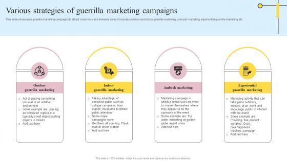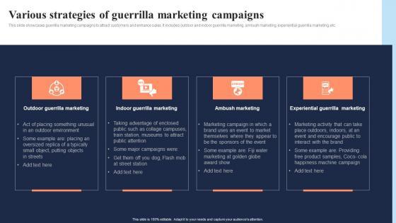 This slide showcases guerrilla marketing campaigns to attract customers and enhance sales. It includes outdoor and indoor guerrilla marketing, ambush marketing, experiential guerrilla marketing, etc. Do you know about Slidesgeeks Various Strategies Of Guerrilla Marketing Campaigns Definitive Guide On Mass Advertising Topics Pdf These are perfect for delivering any kind od presentation. Using it, create PowerPoint presentations that communicate your ideas and engage audiences. Save time and effort by using our pre-designed presentation templates that are perfect for a wide range of topic. Our vast selection of designs covers a range of styles, from creative to business, and are all highly customizable and easy to edit. Download as a PowerPoint template or use them as Google Slides themes. This slide showcases guerrilla marketing campaigns to attract customers and enhance sales. It includes outdoor and indoor guerrilla marketing, ambush marketing, experiential guerrilla marketing, etc.