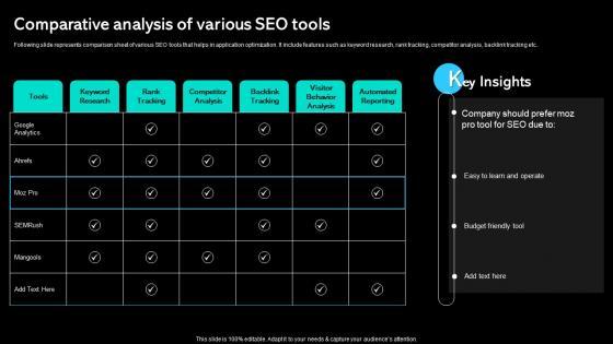 Following slide represents comparison sheet of various SEO tools that helps in application optimization. It include features such as keyword research, rank tracking, competitor analysis, backlink tracking etc. Are you in need of a template that can accommodate all of your creative concepts This one is crafted professionally and can be altered to fit any style. Use it with Google Slides or PowerPoint. Include striking photographs, symbols, depictions, and other visuals. Fill, move around, or remove text boxes as desired. Test out color palettes and font mixtures. Edit and save your work, or work with colleagues. Download Comparative Analysis Of Various SEO Tools Paid Marketing Approach Pictures Pdf and observe how to make your presentation outstanding. Give an impeccable presentation to your group and make your presentation unforgettable. Following slide represents comparison sheet of various SEO tools that helps in application optimization. It include features such as keyword research, rank tracking, competitor analysis, backlink tracking etc.