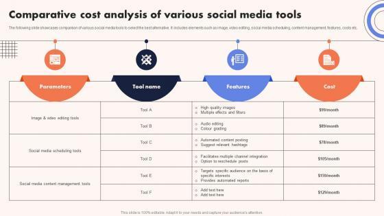 The following slide showcases comparison of various social media tools to select the best alternative. It includes elements such as image, video editing, social media scheduling, content management, features, costs etc. Find highly impressive Comparative Cost Analysis Of Various Social Media Tools Running Marketing Campaigns Strategy SS V on Slidegeeks to deliver a meaningful presentation. You can save an ample amount of time using these presentation templates. No need to worry to prepare everything from scratch because Slidegeeks experts have already done a huge research and work for you. You need to download Comparative Cost Analysis Of Various Social Media Tools Running Marketing Campaigns Strategy SS V for your upcoming presentation. All the presentation templates are 100 percent editable and you can change the color and personalize the content accordingly. Download now The following slide showcases comparison of various social media tools to select the best alternative. It includes elements such as image, video editing, social media scheduling, content management, features, costs etc.