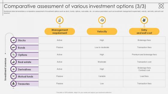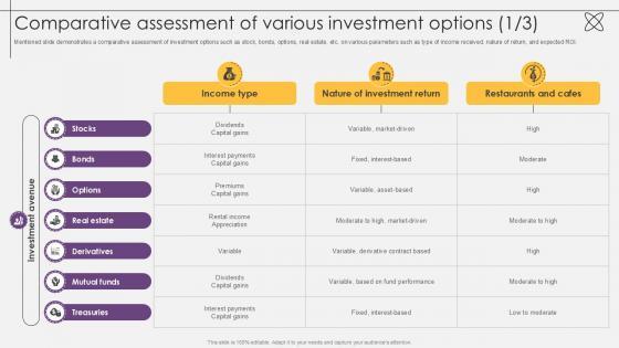 Mentioned slide demonstrates a comparative assessment of investment options such as stock, bonds, options, real estate, etc.on various parameters such as type of income received, nature of return, and expected ROI. Slidegeeks is here to make your presentations a breeze with Comparative Assessment Of Various Investment Options Investment Fund PPT Sample With our easy to use and customizable templates, you can focus on delivering your ideas rather than worrying about formatting. With a variety of designs to choose from, you are sure to find one that suits your needs. And with animations and unique photos, illustrations, and fonts, you can make your presentation pop. So whether you are giving a sales pitch or presenting to the board, make sure to check out Slidegeeks first Mentioned slide demonstrates a comparative assessment of investment options such as stock, bonds, options, real estate, etc.on various parameters such as type of income received, nature of return, and expected ROI.