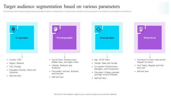 The following slide showcases target market segmentation based on multiple factors. The parameters outlined in slide are geographic, demographic, psychographic, and behavioral. If your project calls for a presentation, then Slidegeeks is your go-to partner because we have professionally designed, easy-to-edit templates that are perfect for any presentation. After downloading, you can easily edit Target Audience Segmentation Based On Various Parameters Effective GTM Techniques Formats PDF and make the changes accordingly. You can rearrange slides or fill them with different images. Check out all the handy templates The following slide showcases target market segmentation based on multiple factors. The parameters outlined in slide are geographic, demographic, psychographic, and behavioral.