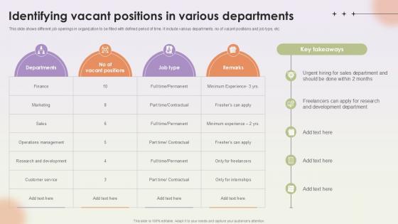 This slide shows different job openings in organization to be filled with defined period of time. It include various departments. no of vacant positions and job type, etc. Make sure to capture your audiences attention in your business displays with our gratis customizable Identifying Vacant Positions In Various Workforce Procurement And Aptitude Evaluation Ppt Slides. These are great for business strategies, office conferences, capital raising or task suggestions. If you desire to acquire more customers for your tech business and ensure they stay satisfied, create your own sales presentation with these plain slides. This slide shows different job openings in organization to be filled with defined period of time. It include various departments. no of vacant positions and job type, etc.