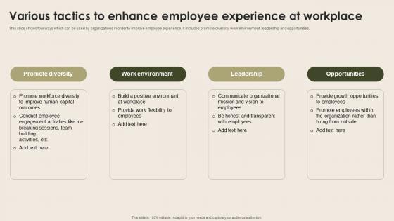 This slide shows four ways which can be used by organizations in order to improve employee experience. It includes promote diversity, work environment, leadership and opportunities. Want to ace your presentation in front of a live audience Our Various Tactics To Enhance Employee Experience Nurturing Positive Work Culture Formats Pdf can help you do that by engaging all the users towards you. Slidegeeks experts have put their efforts and expertise into creating these impeccable powerpoint presentations so that you can communicate your ideas clearly. Moreover, all the templates are customizable, and easy-to-edit and downloadable. Use these for both personal and commercial use. This slide shows four ways which can be used by organizations in order to improve employee experience. It includes promote diversity, work environment, leadership and opportunities.