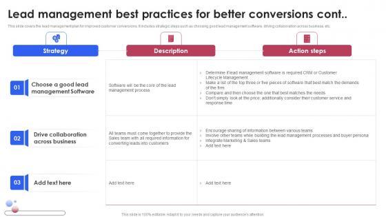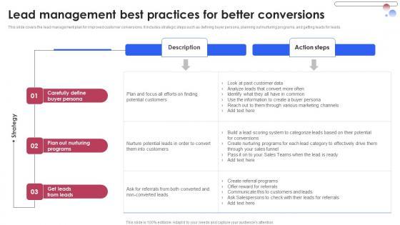 This slide covers the lead management plan for improved customer conversions. It includes strategic steps such as defining buyer persona, planning out nurturing programs, and getting leads for leads. The Lead Management Best Practices For Better Various Techniques For Managing Portrait PDF is a compilation of the most recent design trends as a series of slides. It is suitable for any subject or industry presentation, containing attractive visuals and photo spots for businesses to clearly express their messages. This template contains a variety of slides for the user to input data, such as structures to contrast two elements, bullet points, and slides for written information. Slidegeeks is prepared to create an impression. This slide covers the lead management plan for improved customer conversions. It includes strategic steps such as defining buyer persona, planning out nurturing programs, and getting leads for leads.