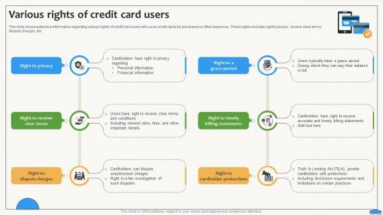 This slide shows extensive information regarding various rights of credit card users who uses credit cards for purchases or other expenses. These rights includes right to privacy, receive clear terms, dispute charges, etc. This modern and well-arranged Various Rights Of Credit Card Users Swipe Smartly A Practical Guide Fin SS V provides lots of creative possibilities. It is very simple to customize and edit with the Powerpoint Software. Just drag and drop your pictures into the shapes. All facets of this template can be edited with Powerpoint, no extra software is necessary. Add your own material, put your images in the places assigned for them, adjust the colors, and then you can show your slides to the world, with an animated slide included. This slide shows extensive information regarding various rights of credit card users who uses credit cards for purchases or other expenses. These rights includes right to privacy, receive clear terms, dispute charges, etc.