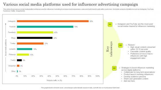 This slide shows various social media platforms that are used for influencer marketing to increase brand awareness, sales and build brand loyalty within customers. It includes analysis of platforms such as Instagram, YouTube, Facebook, Twitter, Snapchat etc. Showcasing this set of slides titled Various Social Media Platforms Used For Influencer Advertising Campaign Portrait Pdf. The topics addressed in these templates are Campaign, Various, Influencer. All the content presented in this PPT design is completely editable. Download it and make adjustments in color, background, font etc. as per your unique business setting. This slide shows various social media platforms that are used for influencer marketing to increase brand awareness, sales and build brand loyalty within customers. It includes analysis of platforms such as Instagram, YouTube, Facebook, Twitter, Snapchat etc.