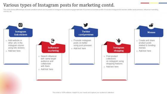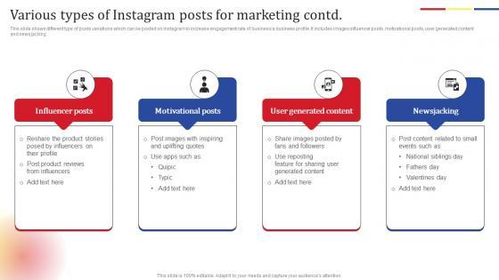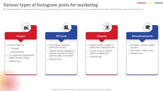 This slide shows different type of posts variations which can be posted on Instagram to increase engagement rate of business a business profile. It includes images, BTS posts, reposts, educational posts, etc. Find a pre designed and impeccable Various Types Instagram Posts Social Media Platform Advertising To Enhance Brand Awareness Designs Pdf. The templates can ace your presentation without additional effort. You can download these easy to edit presentation templates to make your presentation stand out from others. So, what are you waiting for Download the template from Slidegeeks today and give a unique touch to your presentation. This slide shows different type of posts variations which can be posted on Instagram to increase engagement rate of business a business profile. It includes images, BTS posts, reposts, educational posts, etc.