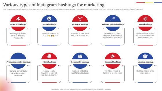 This slide shows different categories of hashtags which can be used to maximize content engagement rate. It includes product service, niche, community, seasonal, location and many other types of hashtags. Slidegeeks is one of the best resources for PowerPoint templates. You can download easily and regulate Various Types Of Instagram Social Media Platform Advertising To Enhance Brand Awareness Guidelines Pdf for your personal presentations from our wonderful collection. A few clicks is all it takes to discover and get the most relevant and appropriate templates. Use our Templates to add a unique zing and appeal to your presentation and meetings. All the slides are easy to edit and you can use them even for advertisement purposes. This slide shows different categories of hashtags which can be used to maximize content engagement rate. It includes product service, niche, community, seasonal, location and many other types of hashtags.