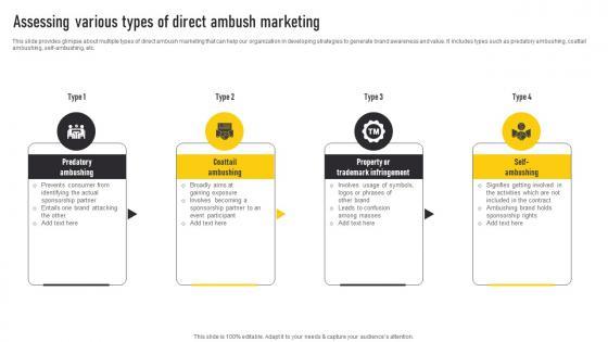 This slide provides glimpse about multiple types of direct ambush marketing that can help our organization in developing strategies to generate brand awareness and value. It includes types such as predatory ambushing, coattail ambushing, self ambushing, etc. If you are looking for a format to display your unique thoughts, then the professionally designed Assessing Various Types Of Direct Ambush Marketing Automate Guerrilla Promotional Graphics Pdf is the one for you. You can use it as a Google Slides template or a PowerPoint template. Incorporate impressive visuals, symbols, images, and other charts. Modify or reorganize the text boxes as you desire. Experiment with shade schemes and font pairings. Alter, share or cooperate with other people on your work. Download Assessing Various Types Of Direct Ambush Marketing Automate Guerrilla Promotional Graphics Pdf and find out how to give a successful presentation. Present a perfect display to your team and make your presentation unforgettable. This slide provides glimpse about multiple types of direct ambush marketing that can help our organization in developing strategies to generate brand awareness and value. It includes types such as predatory ambushing, coattail ambushing, self ambushing, etc.