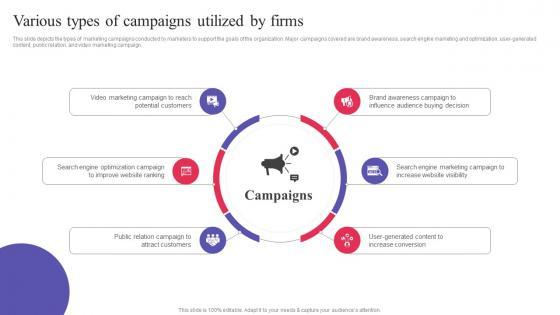 This slide depicts the types of marketing campaigns conducted by marketers to support the goals of the organization. Major campaigns covered are brand awareness, search engine marketing and optimization, user-generated content, public relation, and video marketing campaign. Make sure to capture your audiences attention in your business displays with our gratis customizable Various Types Of Campaigns Utilized By Firms Digital Promotional Campaign Designs Pdf. These are great for business strategies, office conferences, capital raising or task suggestions. If you desire to acquire more customers for your tech business and ensure they stay satisfied, create your own sales presentation with these plain slides. This slide depicts the types of marketing campaigns conducted by marketers to support the goals of the organization. Major campaigns covered are brand awareness, search engine marketing and optimization, user-generated content, public relation, and video marketing campaign.