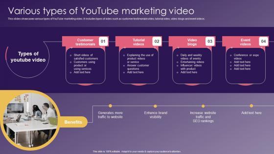 This slides showcases various types of YouTube marketing video. It includes types of video such as customer testimonials video, tutorial video, video blogs and event videos. If your project calls for a presentation, then Slidegeeks is your go to partner because we have professionally designed, easy to edit templates that are perfect for any presentation. After downloading, you can easily edit Various Types Youtube Marketing School Promotion Strategies To Increase Enrollment Mockup Pdf and make the changes accordingly. You can rearrange slides or fill them with different images. Check out all the handy templates This slides showcases various types of YouTube marketing video. It includes types of video such as customer testimonials video, tutorial video, video blogs and event videos.