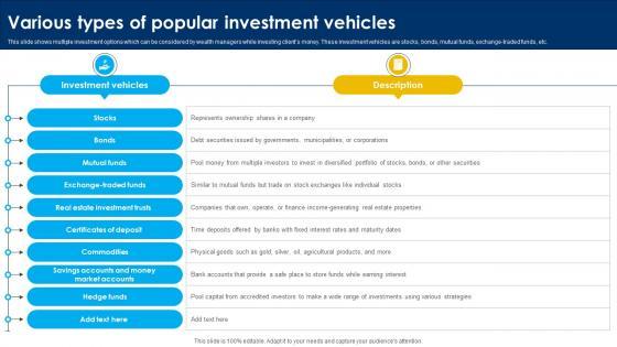 This slide shows multiple investment options which can be considered by wealth managers while investing clients money. These investment vehicles are stocks, bonds, mutual funds, exchange-traded funds, etc. This modern and well-arranged Various Types Of Popular Investment Vehicles Strategic Wealth Management And Financial Fin SS V provides lots of creative possibilities. It is very simple to customize and edit with the Powerpoint Software. Just drag and drop your pictures into the shapes. All facets of this template can be edited with Powerpoint, no extra software is necessary. Add your own material, put your images in the places assigned for them, adjust the colors, and then you can show your slides to the world, with an animated slide included. This slide shows multiple investment options which can be considered by wealth managers while investing clients money. These investment vehicles are stocks, bonds, mutual funds, exchange-traded funds, etc.